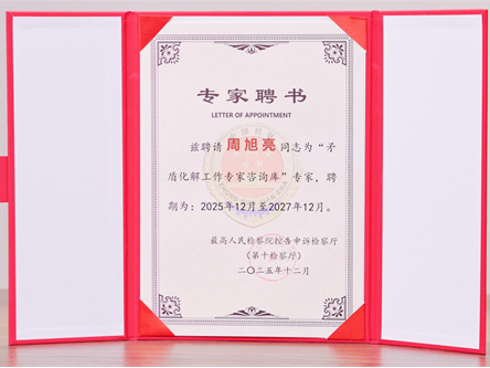 周旭亮受聘为最高人民检察院控告申诉检察厅“矛盾化解工作专家咨询库”专家
